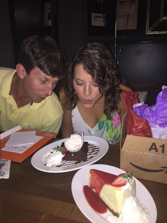 The mirror informed me that we would be going to dinner that night at Frankie Bones, a delicious restaurant on the island and it gave me my first hint about the birthday weekend getaway Robert had planned: Somewhere in Florida. Hmm. Once I came downstairs, I found a birthday note from Renly, only this time it was written on tinfoil from last nights dinner and sitting on top of the stove! That sweet dog of mine is so resourceful 🙂