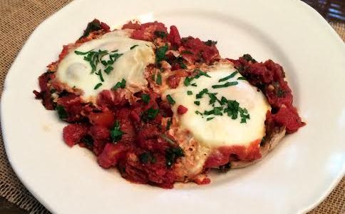 So after a busy week and a chilly evening spent putt putting on Friday per my sweet nephew’s request, Saturday called for a hot breakfast. I also needed to have all of the ingredients on hand since I needed to clean out the fridge before we left town. Eggs in purgatory fit the bill, so much so that I cut my Saturday morning workout short so I could hurry home and scarf them down. I don’t usually go to the gym during the weekend so I only felt marginally guilty leaving. Although for the sake of complete disclosure I have been known to leave the gym early on a week day when hungry also. Who can work out on an empty stomach? Really. But back to the eggs…